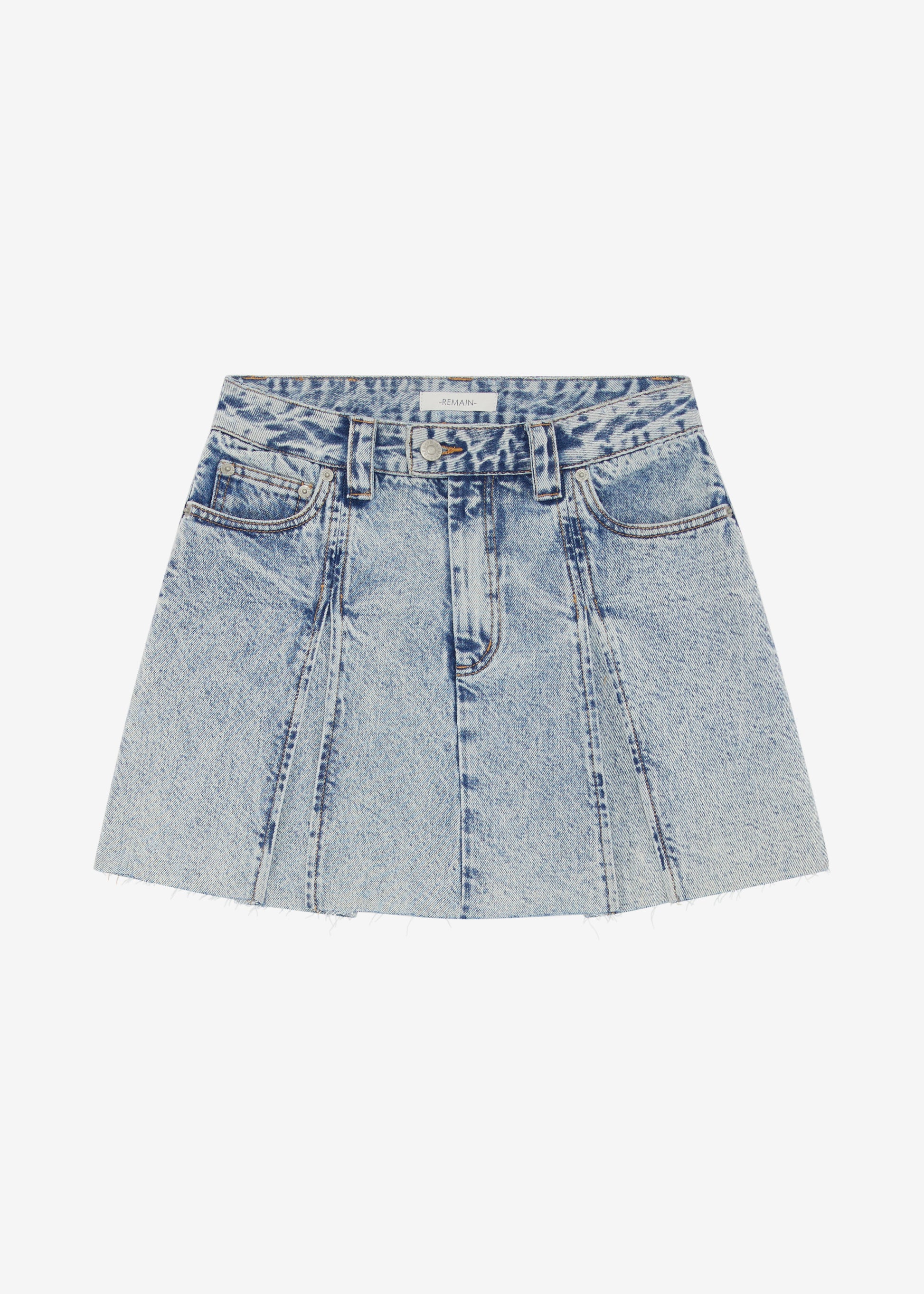 Made from durable rigid cotton denim. This stylish mini skirt showcases wide double pleats, embellished with classic denim skirt details. With its trendy light blue wash, this skirt offers versatility and flair for your wardrobe.