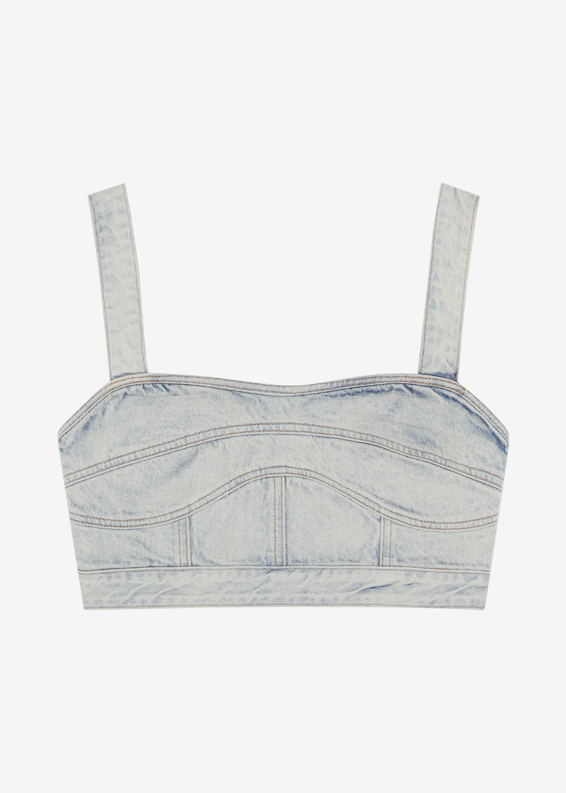Crafted from 100% rigid denim with a fashionable light wash, this bralette stands out with its adjustable straps and intricate paneling details, offering a figure-enhancing bodycon fit. Its zip closure at the back ensures both a secure and comfortable wear. A must-have for your summer holiday wardrobe, this versatile piece effortlessly complements high-waisted skirt or shorts.