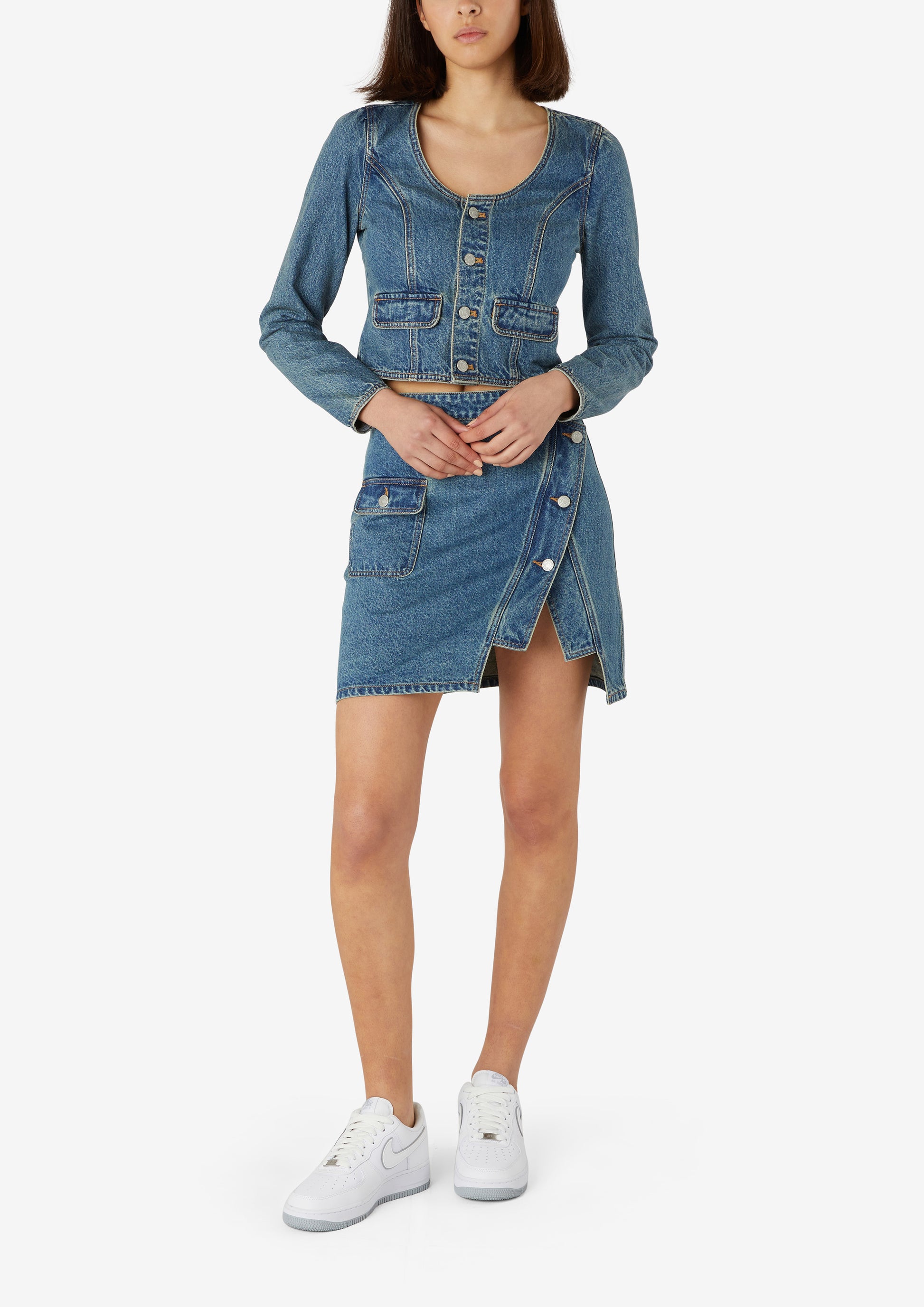 Renowned for its clever contemporary design inspired by classic denim jackets. Made from 100% cotton denim, it boasts a sleek and streamlined silhouette that sits gracefully on the waist. For a chic ensemble, style with a cropped jacket and stylish leather knee boots.