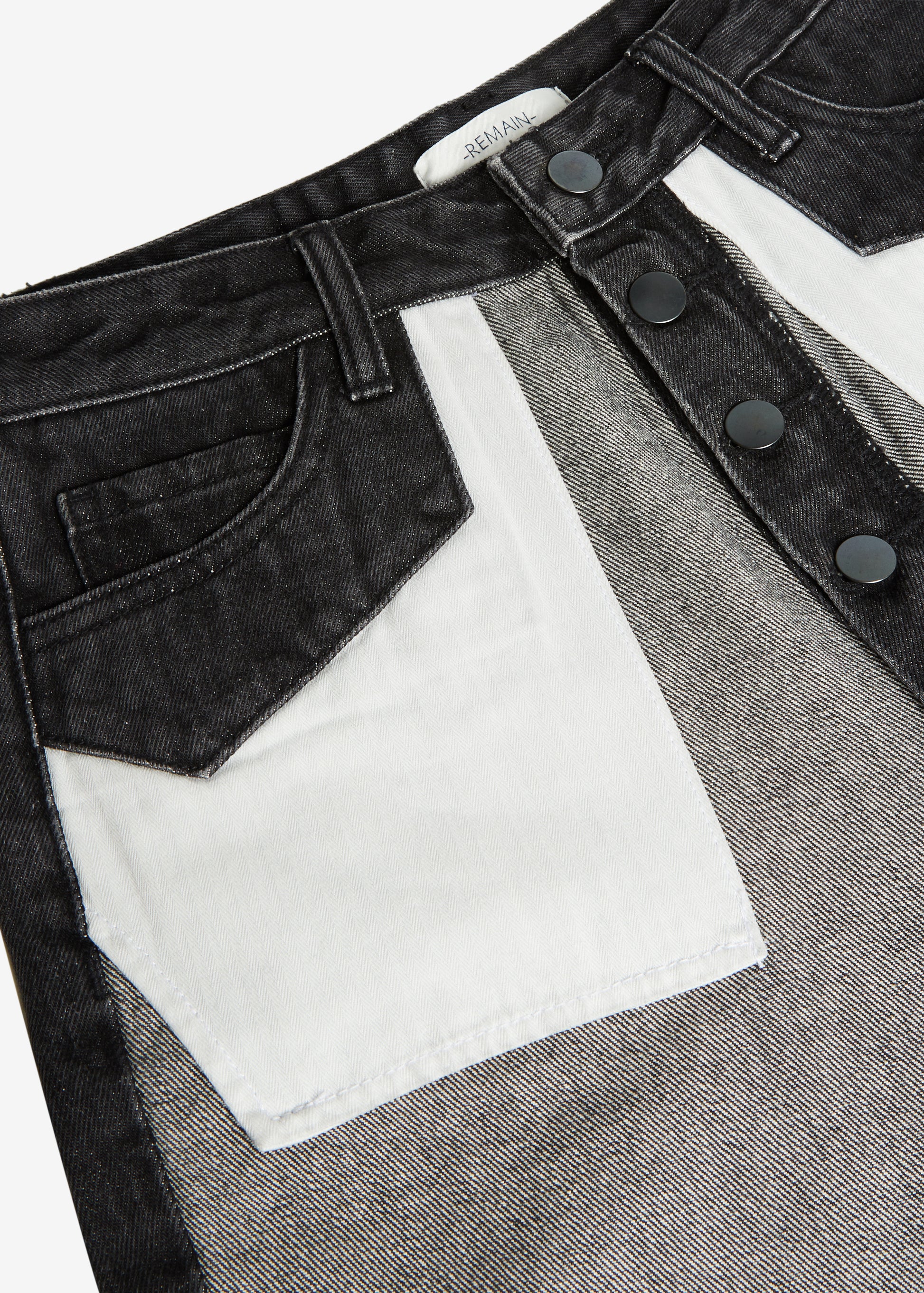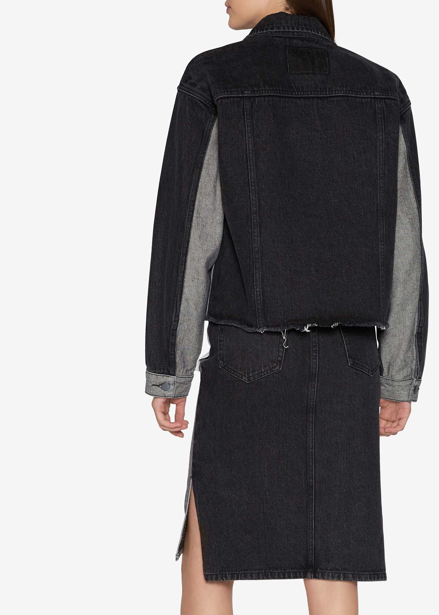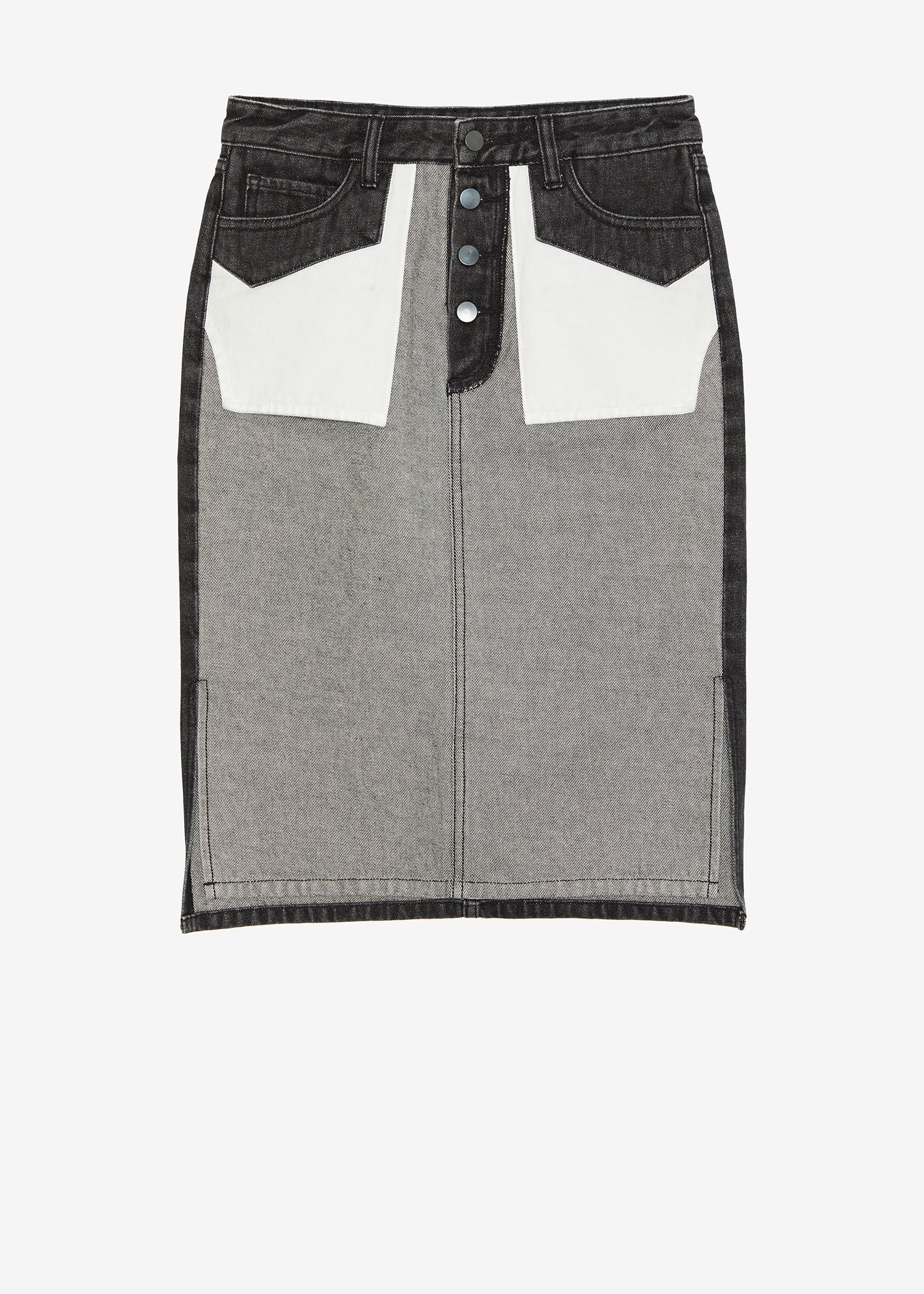 Signature mid-rise skirt in black, crafted with sturdy cotton denim. Inside-out design offers a fun and contemporary twist on the classic denim skirt. It's cut in a classic pencil silhouette.