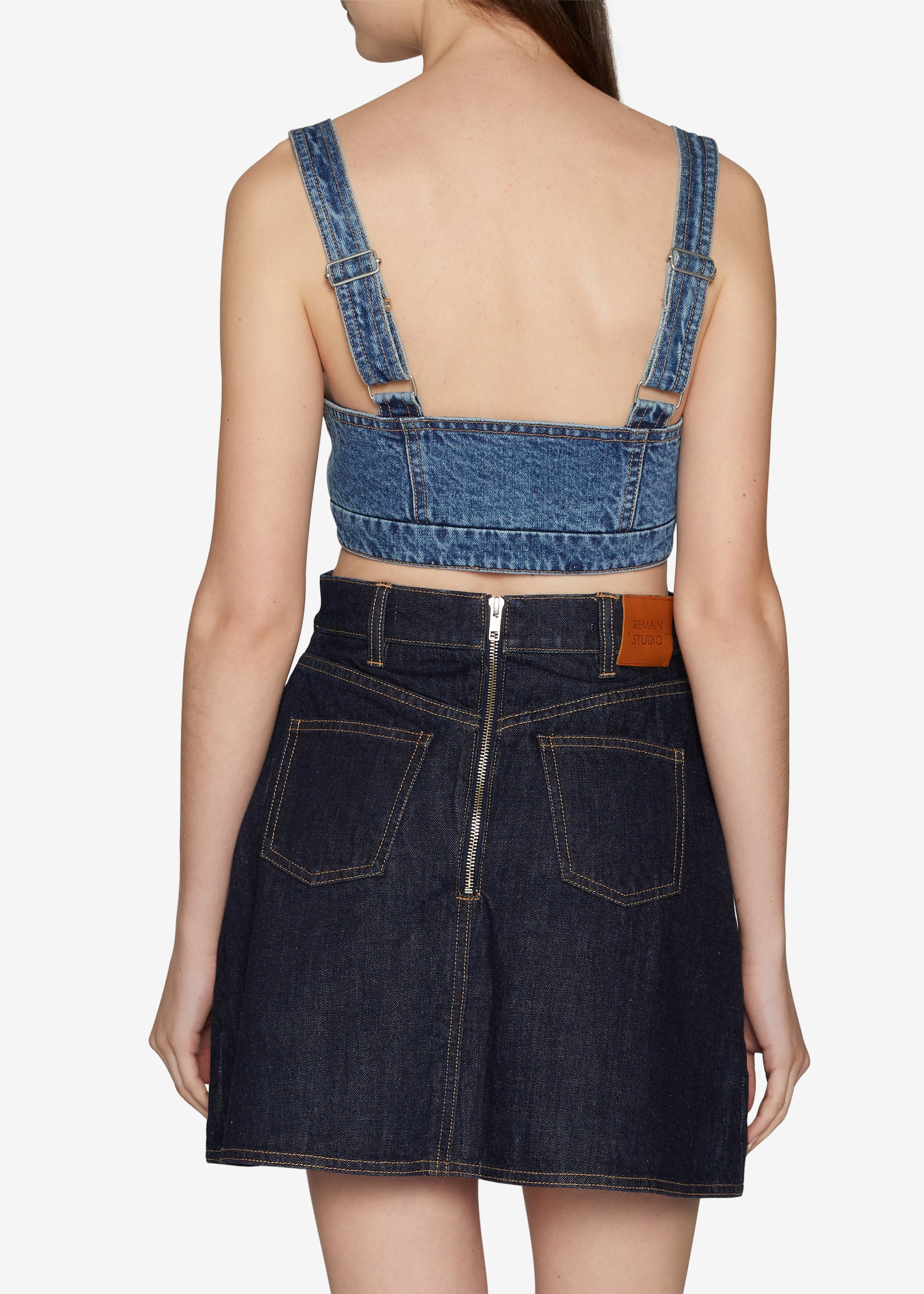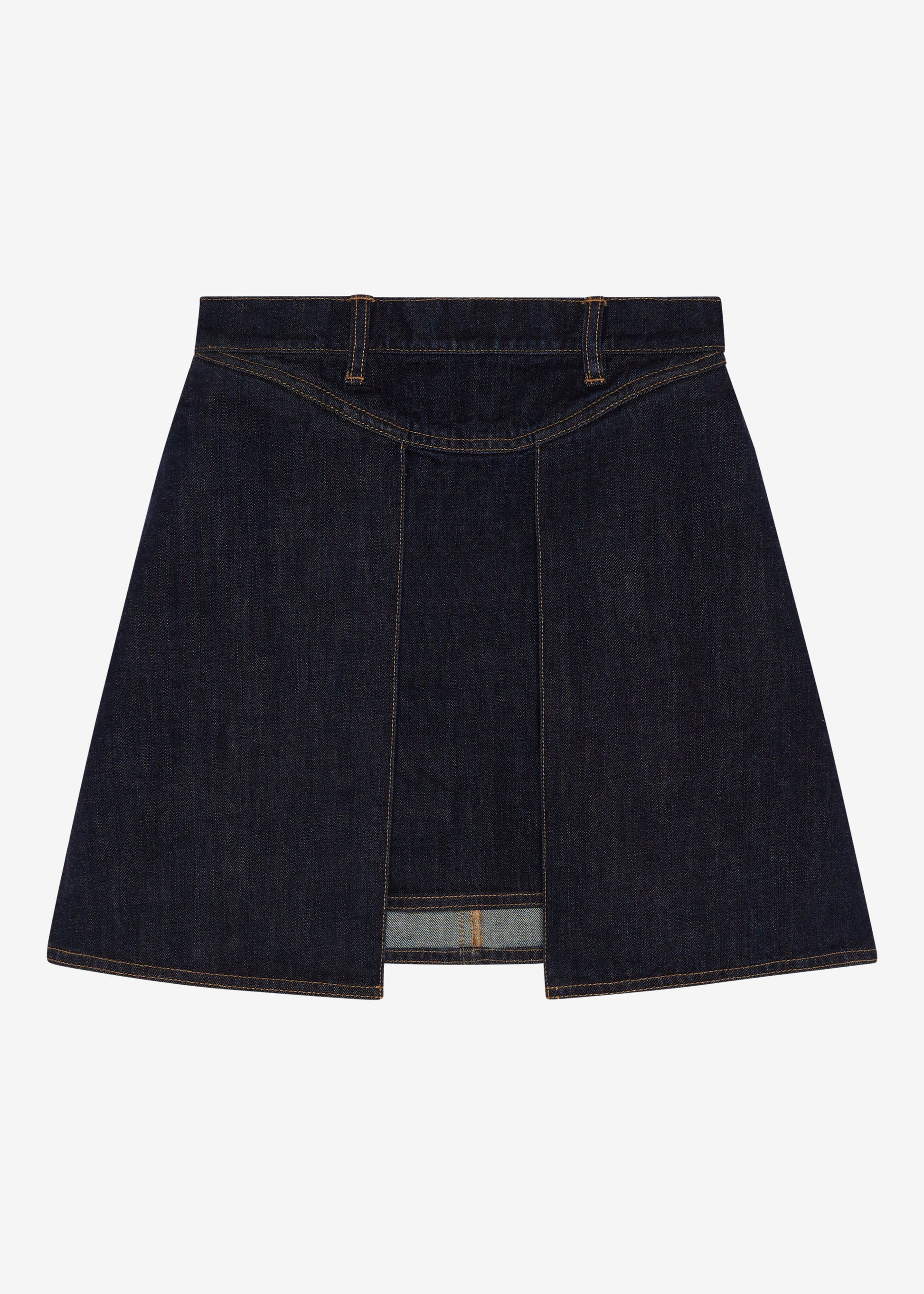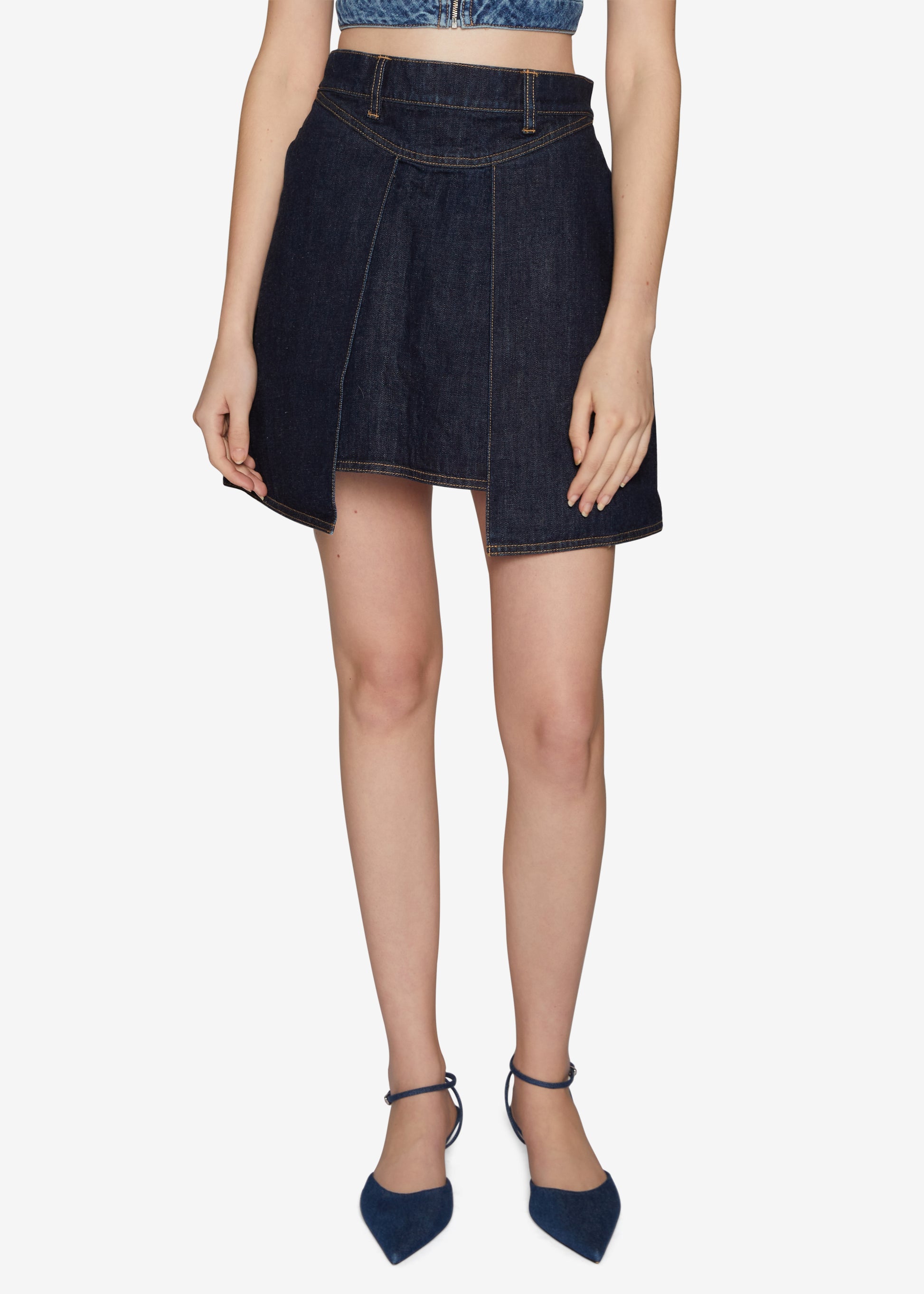 This high waist mini skirt is cut from medium weight indigo denim in an A-line silhouette. Zip back with classic denim details and yellow topstitching. Dark indigo denim created a clean contemporary look. Wear yours with matching simple tee or tank.