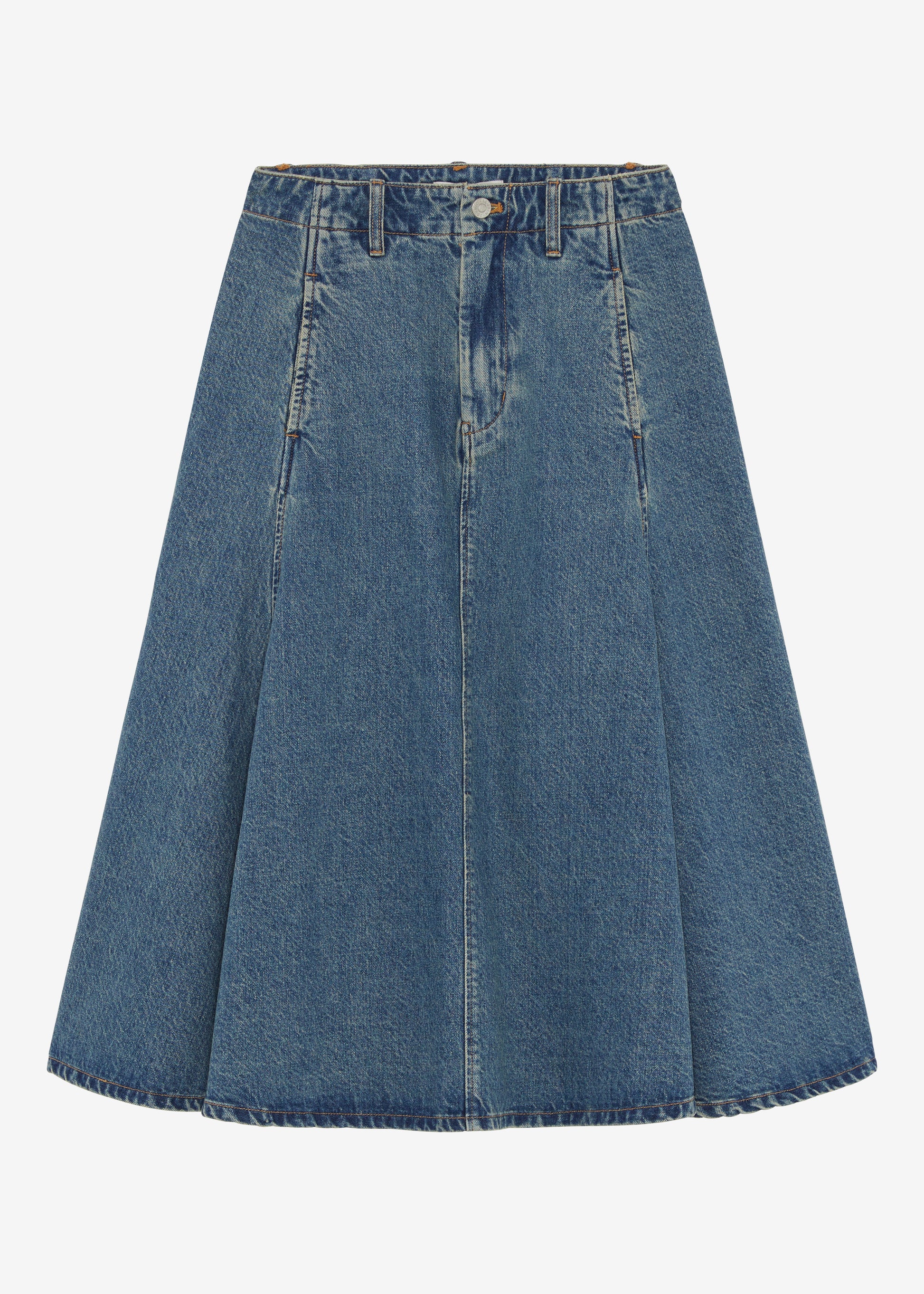 Experience the sophistication embodied by our 'Sabis' midi denim skirt, now available in a delightful indigo shade. This skirt has been thoughtfully created by expertly cutting and skillfully stitching denim panels, enhancing its naturally flattering feminine form. Effortlessly team it with a modest sweater, and don't hesitate to enhance your style with vibrant accessories.