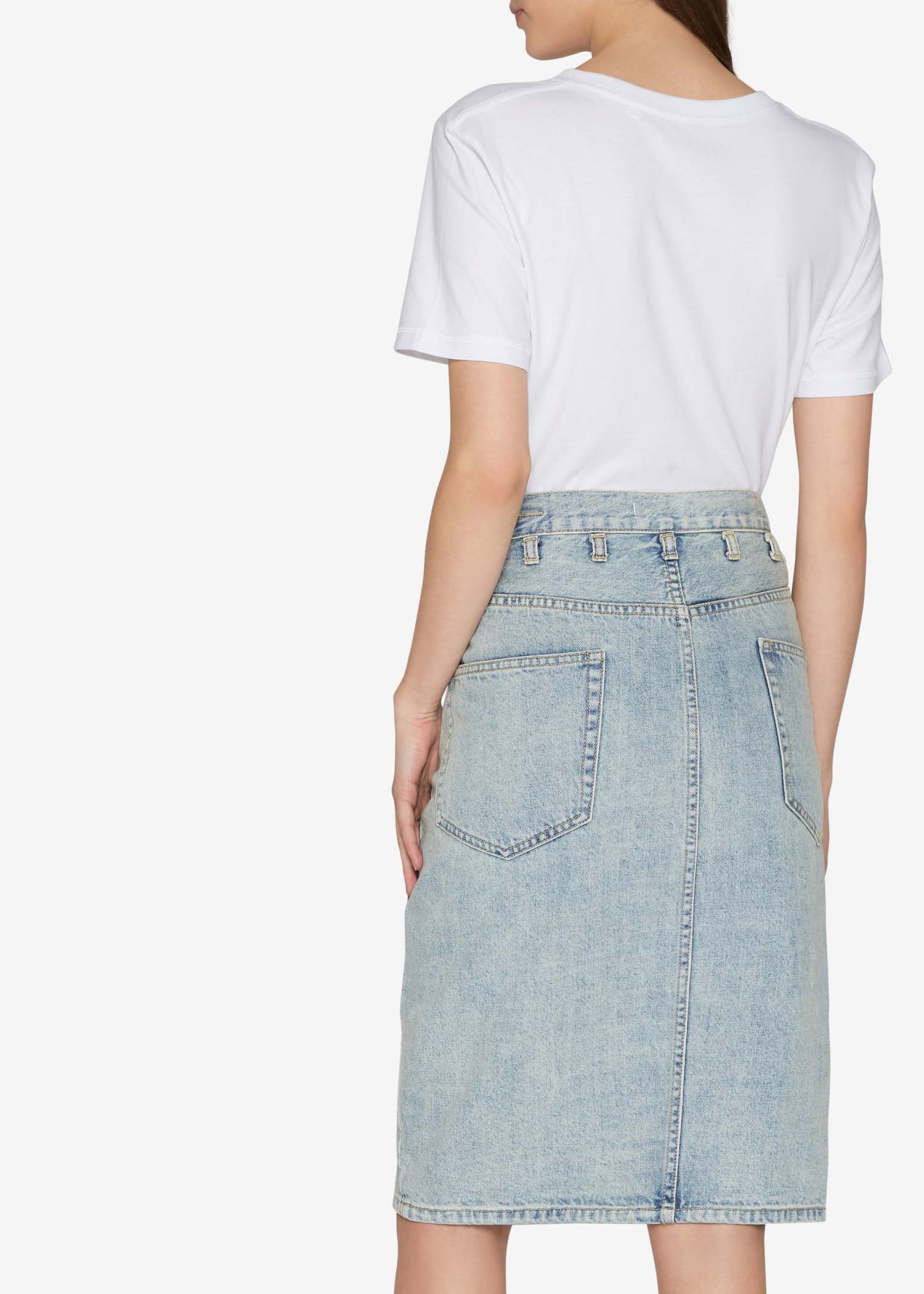 Wrapping on the front with adjustable hook and bar fastener to fit different sizes. Heavily washed in light blue. Knee-length, designed to be worn at waist.
